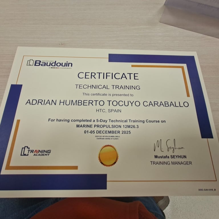 Formación especializada sobre el motor diésel Baudouin 12M26.3, profundizando en su funcionamiento, mantenimiento y aplicaciones. Esta experiencia me permitió conocer de primera mano sus características técnicas, sistemas de inyección, eficiencia de combustible y normativas de emisiones, reforzando mis competencias en motores marinos de alto rendimiento.